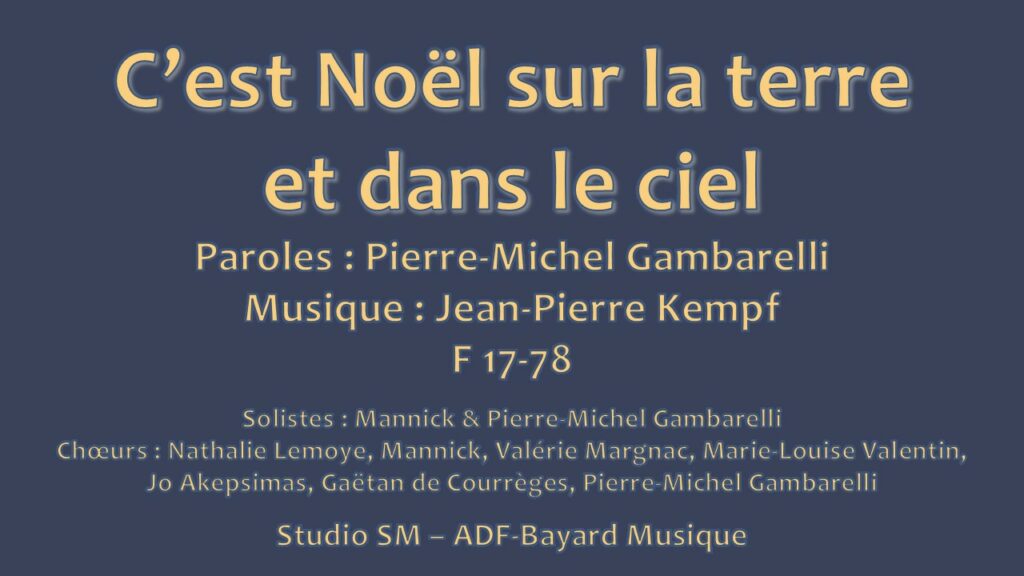 Veillée de Noël : « Un signe dans le ciel » >>> Paroles : Pierre-Michel GambarelliMusique : Jean-Pierre KempfF 17-78 C’EST NOËL SUR LA TERRE ET DANS LE CIEL.DIEU EST NÉ, NOUS ANNONCENT LES BERGERS Réveillez-vous, n’ayez pas peur,Voici la nuit où tout commence.Un soleil au fond de nos cœursFait naître en nous une espérance. Dépêchez-vous, on … Lire la suite de C’est Noël sur la terre et dans le ciel